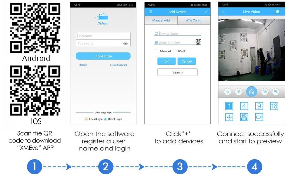 Xmeye Cloud Access: Monitor your cameras from anywhere via smartphone.