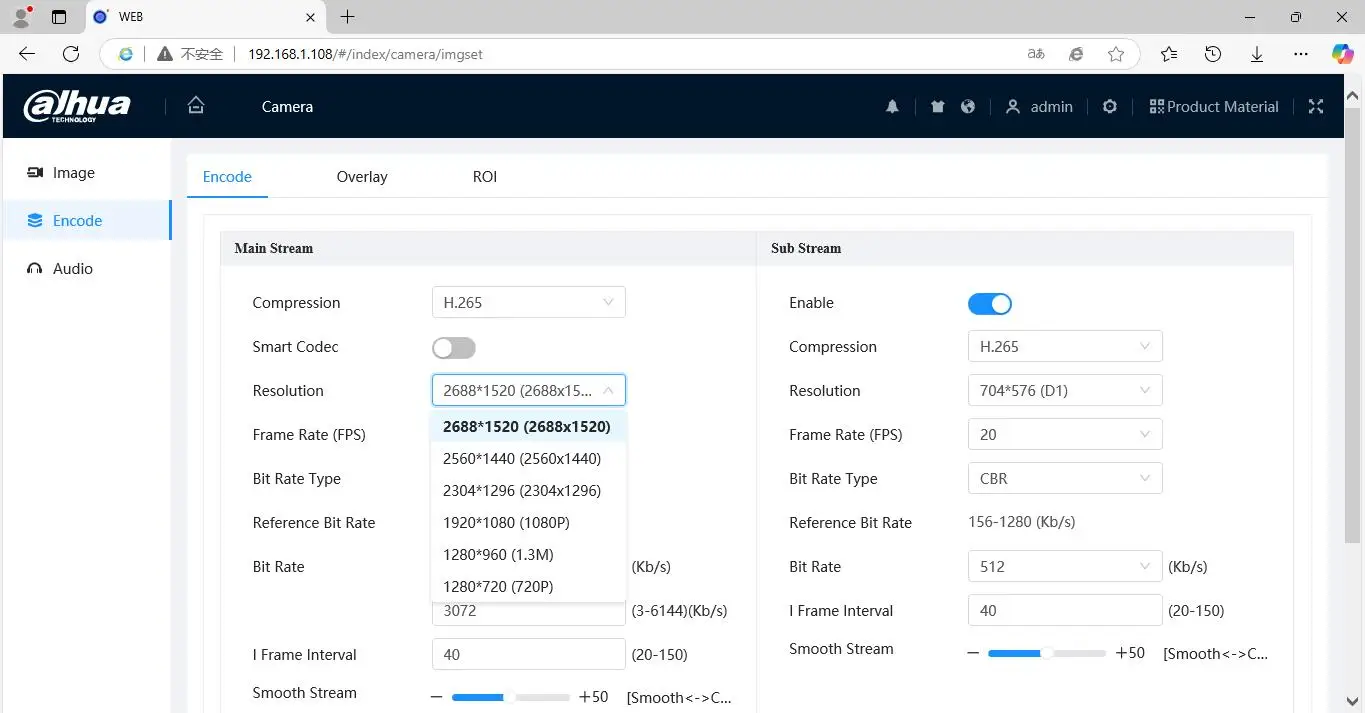 Main stream: 2688 × 1520@(1–20 fps)/2560 × 1440@(1–25/30 fps) sub stream: 704 × 576@(1–25 fps)/704 × 480@(1–30 fps) *The values above are the max. frame rates of each stream; for multiple streams, the values will be subjected to the total encoding capacity. |