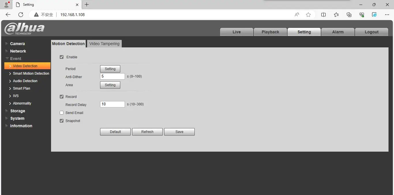 - > Abnormality detection: Motion detection, video tampering, audio detection, no SD card, SD card full, SD card error, network disconnection, IP conflict, illegal access, and voltage detection.