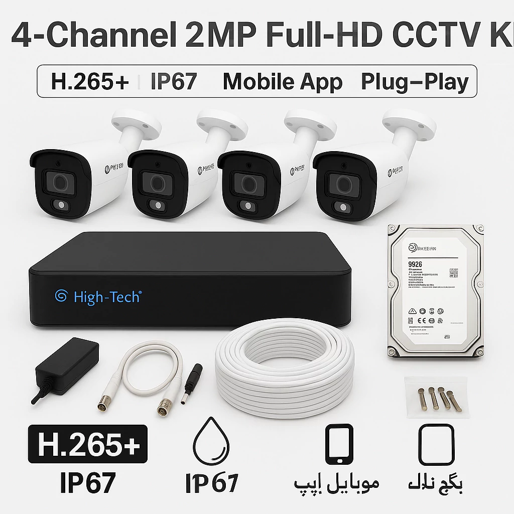 Protect your property with the High Tech 4-Channel 2MP Full-HD CCTV Kit, designed for reliable 24/7 surveillance in homes, shops, and offices across Pakistan. This security system includes 4x 2MP bullet-style cameras with crystal-clear video, infrared night vision, and IP67 waterproof rating, making them perfect for indoor and outdoor use.