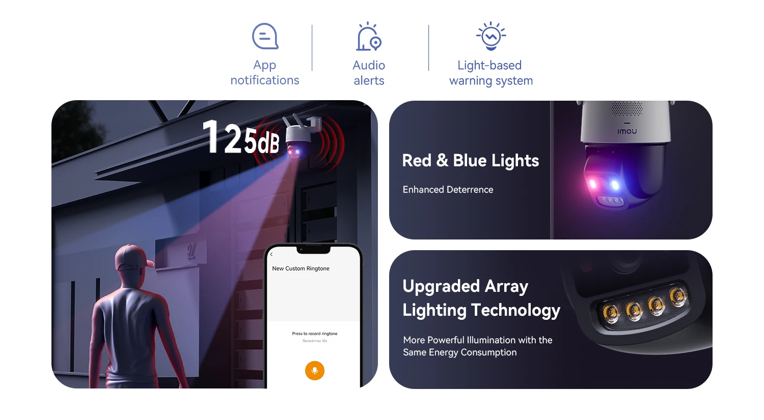 🚨 Red & Blue Warning Lights – Active deterrence against intruders
