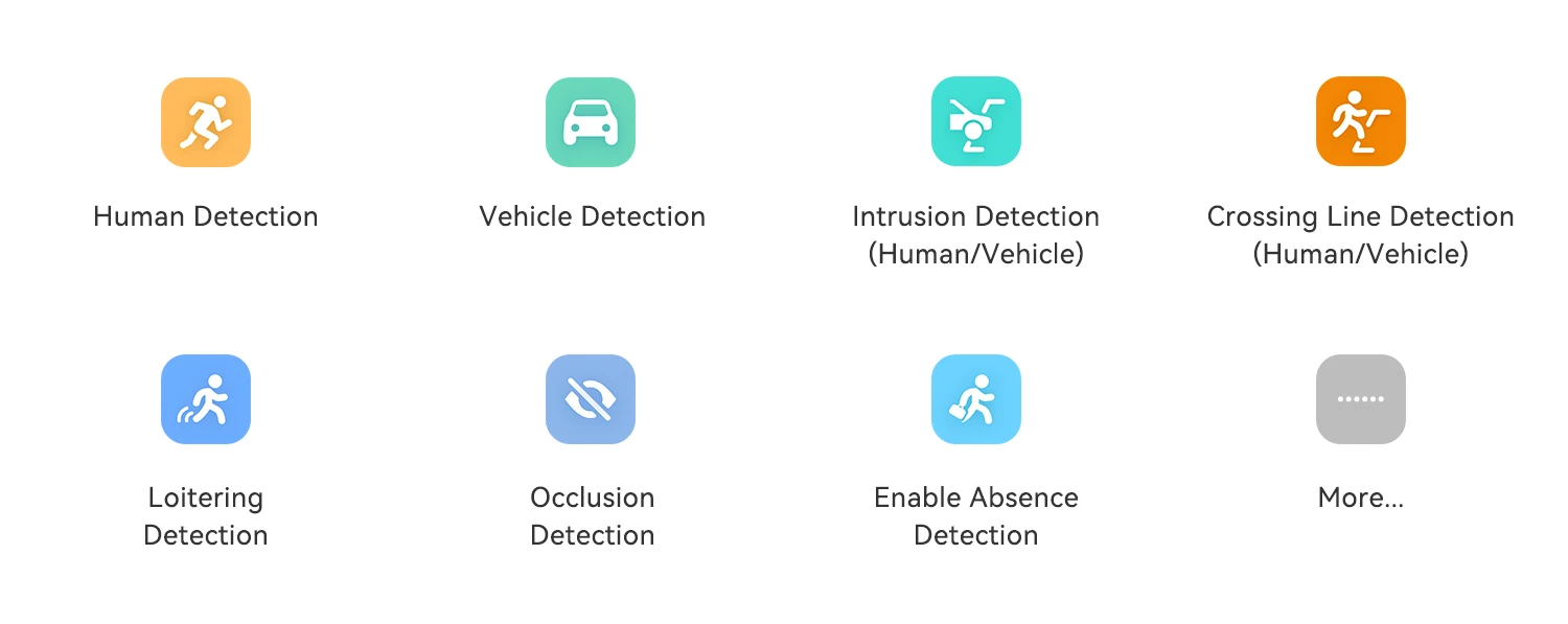 ● Crossing Line Detection (Human/Vehicle) ● Loitering Detection ● Occlusion Detection ● Enable Absence