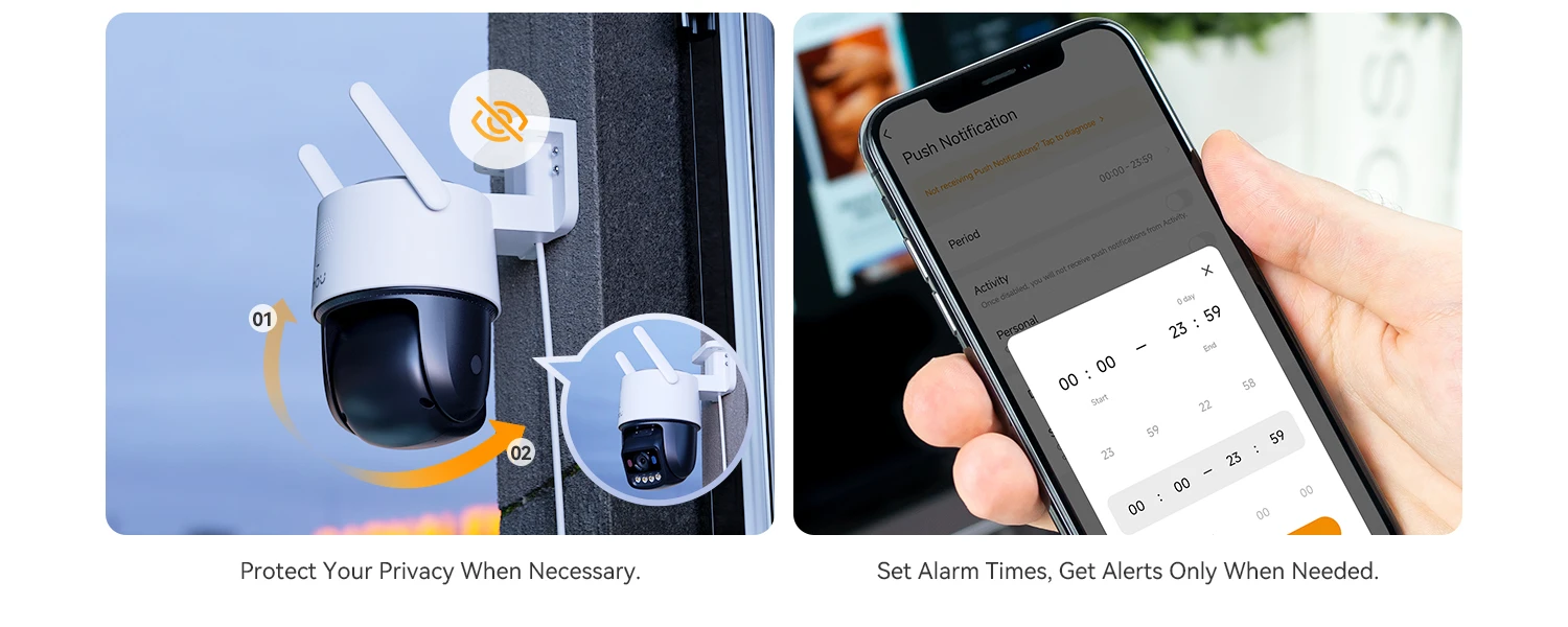 Receives notifications from APP. Enable Imou Notifications via “Settings”->” Notifications” on your iPhone and “Me”-> “Settings”-> “Notice” on Imou APP.