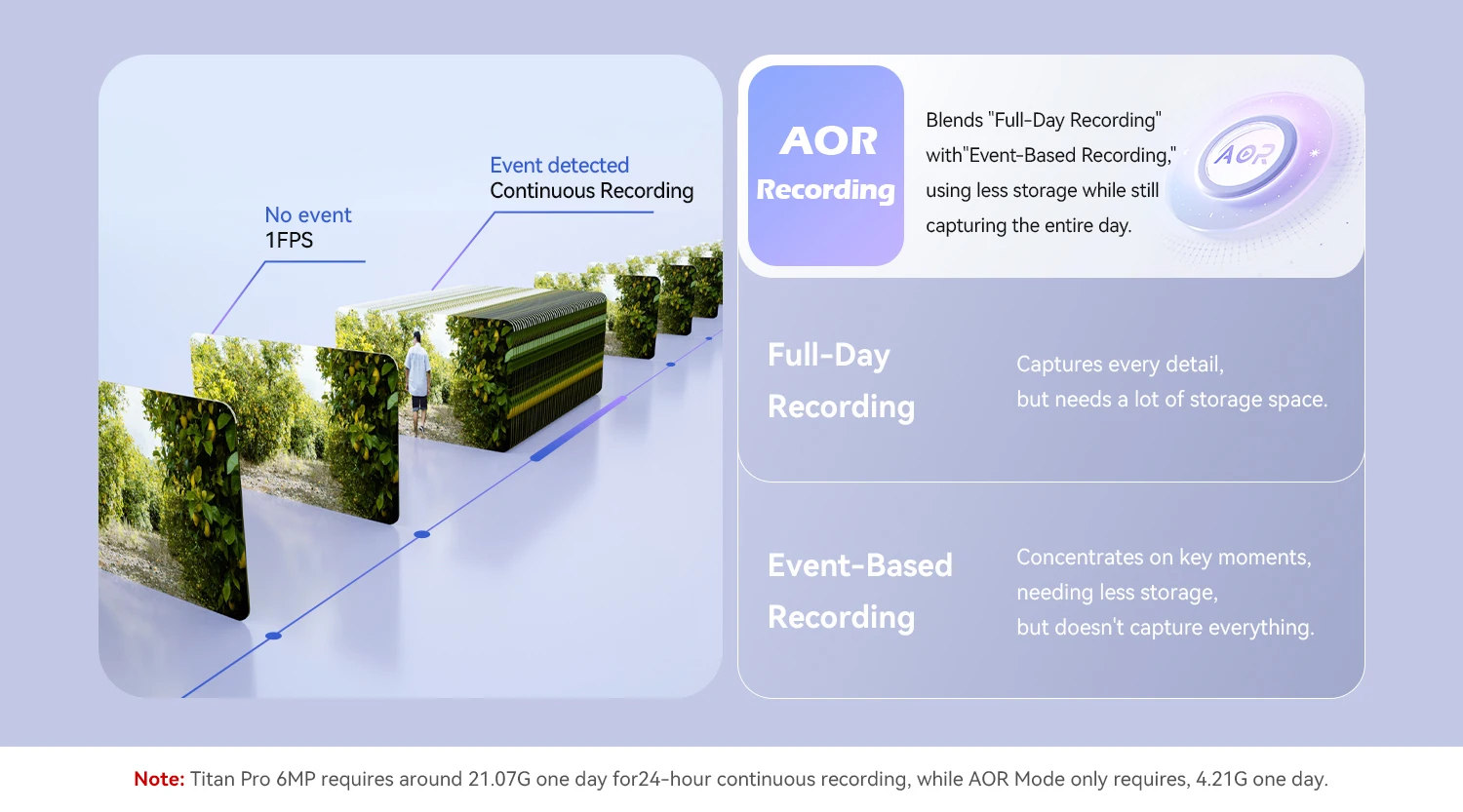 Note:Titan Pro 6MP requires around 21.07G one day for 24-hour continuous recording,while AOR Mode only requires,4.21G one day.