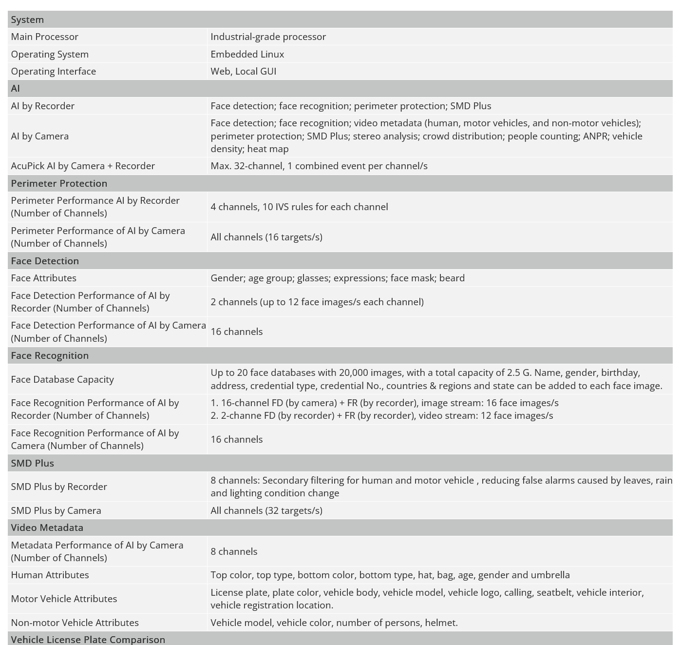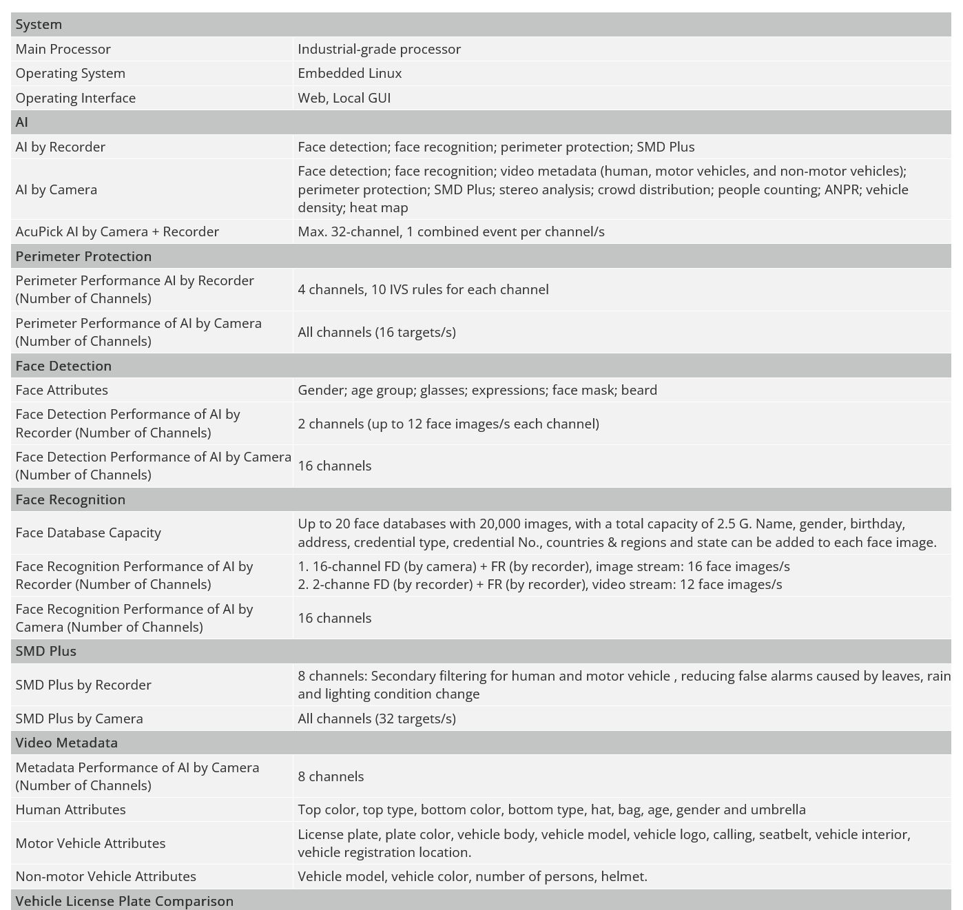 > AI by Recorder supports 2-channel face detection and recognition, up to 20 face databases and 20,000 face images; 4-channel perimeter protection; 8-channel SMD Plus.