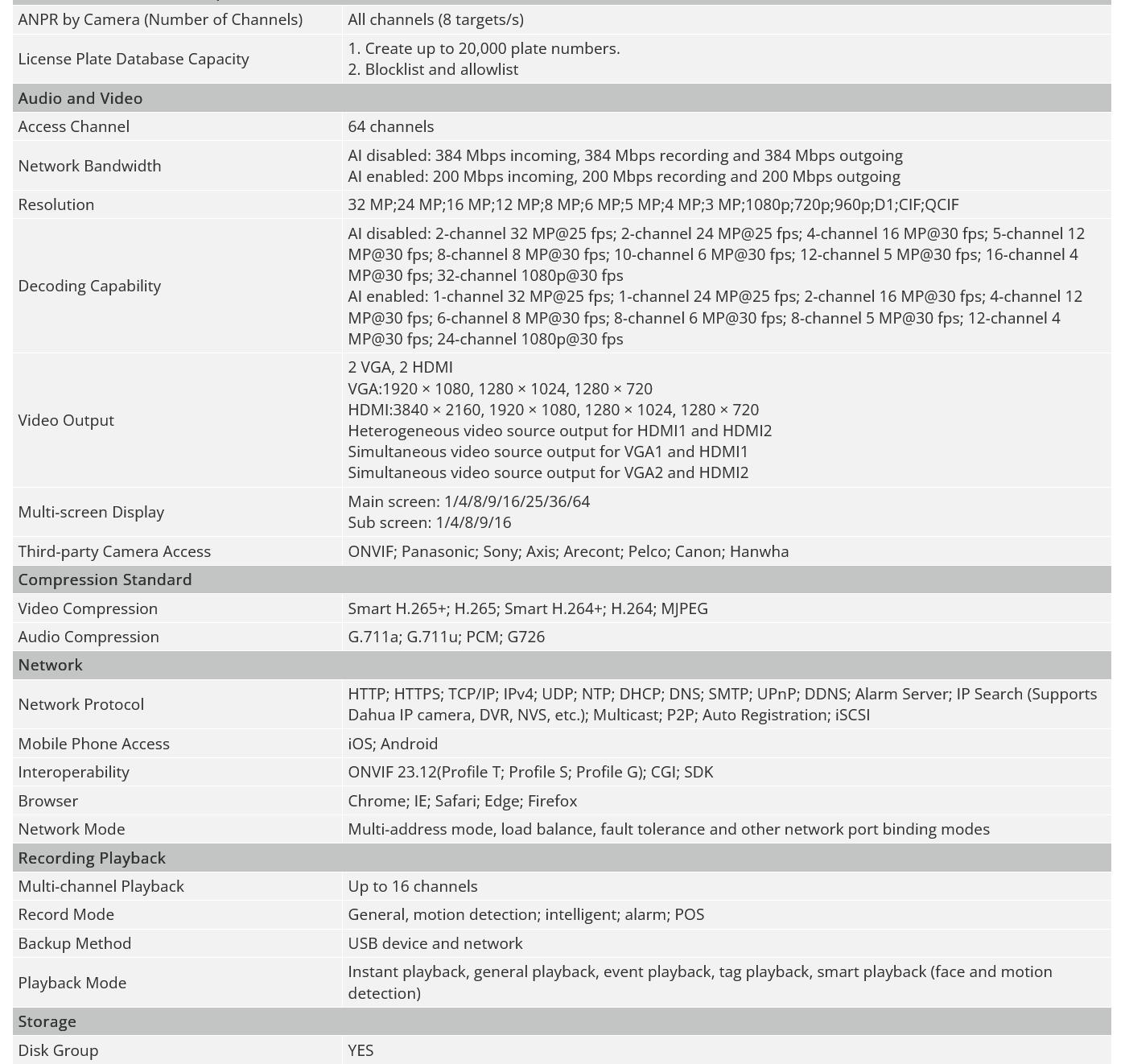 With a maximum bandwidth support of 384 Mbps for incoming, recording, and outgoing data, this system can efficiently manage heavy data loads. It is compatible with IP cameras with resolutions up to 32 MP, making it suitable for high-resolution surveillance applications.