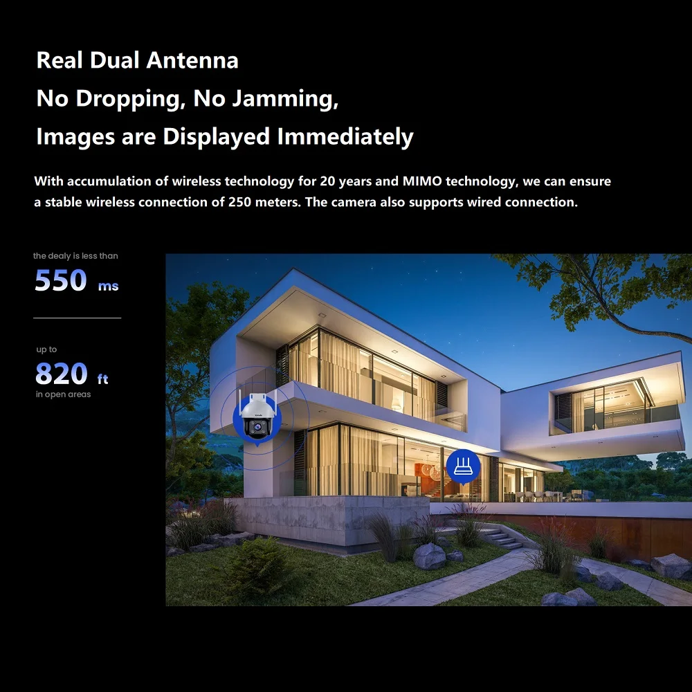 With accumulation of wireless technology for 20 years and MIMO technology, we can ensure a stable wireless connection of 250 meters. The camera also supports wired connection.